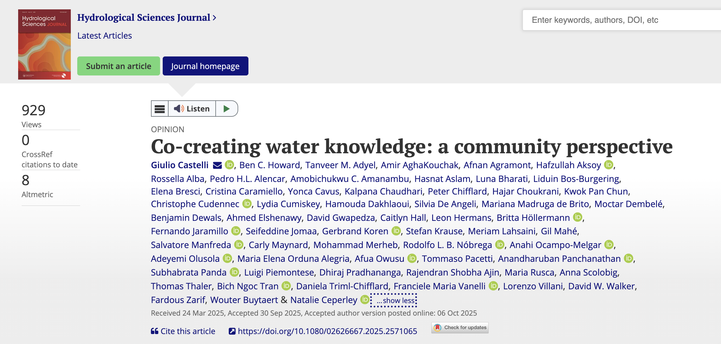 Castelli, G., Howard, B. C., Adyel, T. M., AghaKouchak, A., Agramont, A., Aksoy, H., … Ceperley, N. (2025). Co-creating water knowledge: a community perspective. Hydrological Sciences Journal. https://doi.org/10.1080/02626667.2025.2571065